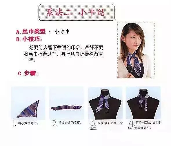 “絲巾”纏綿,絲絲入扣。一條小小的絲巾,可以打破職業(yè)裝的千篇一律,讓你瞬間秀出個(gè)性,流露優(yōu)雅。下面是一些小方巾的的常見(jiàn)系法,簡(jiǎn)單易學(xué),一共有七款,希望有一款最適合你哦。